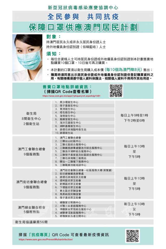 新型冠狀病毒感染應變協調中心公佈第八輪保障口罩供應澳門居民計劃於明 2日開始特區政府保證口罩供應充足市民在第八輪計劃期間的任何時間都 可購買到口罩呼籲市民根據自己需要和口罩剩餘數量安排時間購買口罩毋需急 於首兩日前往購買可選擇在售賣期較後時間購買以. 應變協調中心表示明天開始將推出第八輪保障口罩計劃執行方式售賣點及售賣時間等與過往相同有84個售賣點三週歲至八週歲的兒童可購買5個兒童口罩和5個成人口罩 呼籲市民根據自己的需要和口罩的剩餘量去購買口罩市民亦毋需急於首幾天前往購買避免出現人群聚集或輪候時間過.