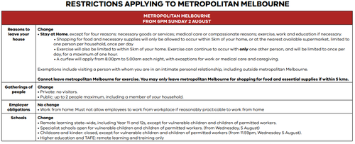 Victorian Premier Daniel Andrews has announced a raft of restrictions on workplaces under the stage 4 lockdown covering Melbourne. Business restrictions On 3 August the Stage 4 restrictions for business were announced which will greatly impact many businesses in Victoria. Then click on Work and study.