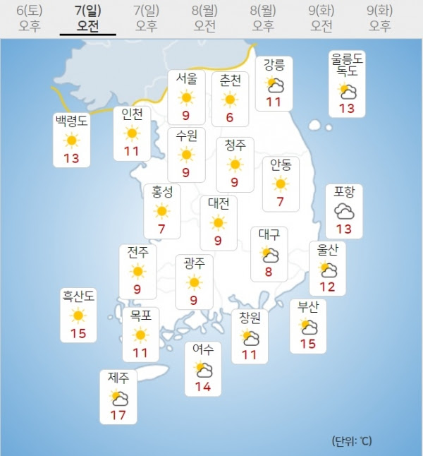 따라서 전국이 대체로 흐리겠고 전날에 이어 비가 이어지는 곳이 있겠다. 일요일인 10월 17일 오늘의 날씨는 전국이 대체로 맑은 가운데 아침 기온은 어제보다 1015도 가량 큰 폭으로 떨어져 최저 -37도를 기록하겠다. 아침 917도 낮 1019도이며 특히 낮 기온은 입동立冬인 어제보다 38도 떨어져 아침기온과 비슷할 정도로 쌀쌀하겠다.